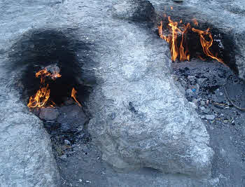 | Наконец, порядком уставшие и взмокшие туристы выходят на относительно небольшое (быть может размерами с футбольное поле) пространство, напрочь лишенное растительности. Под ногами лежит серая скалистая горная порода. Обычно в это время уже совсем темно, так как солнце прячется за вершинами Таврских гор. Вдруг тишину разрывают первые удивленные возгласы. Тут и там из-под земли на короткое время вырываются языки пламени, ярко освещая окружающее пространство. Этот физический процесс идет хаотично, самопроизвольно, 365 дней в году, не подчиняясь внешним воздействиям уже две тысячи лет. |